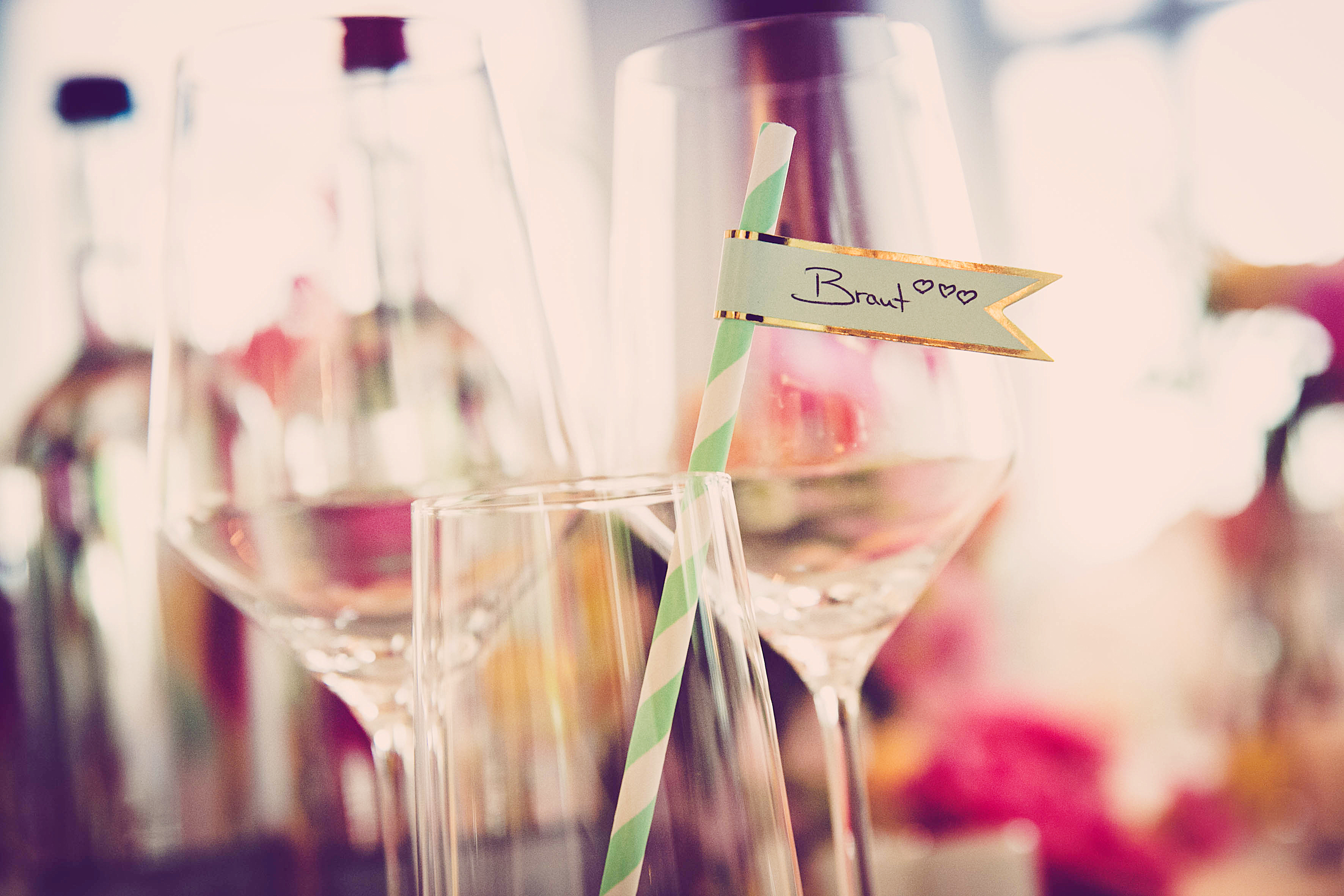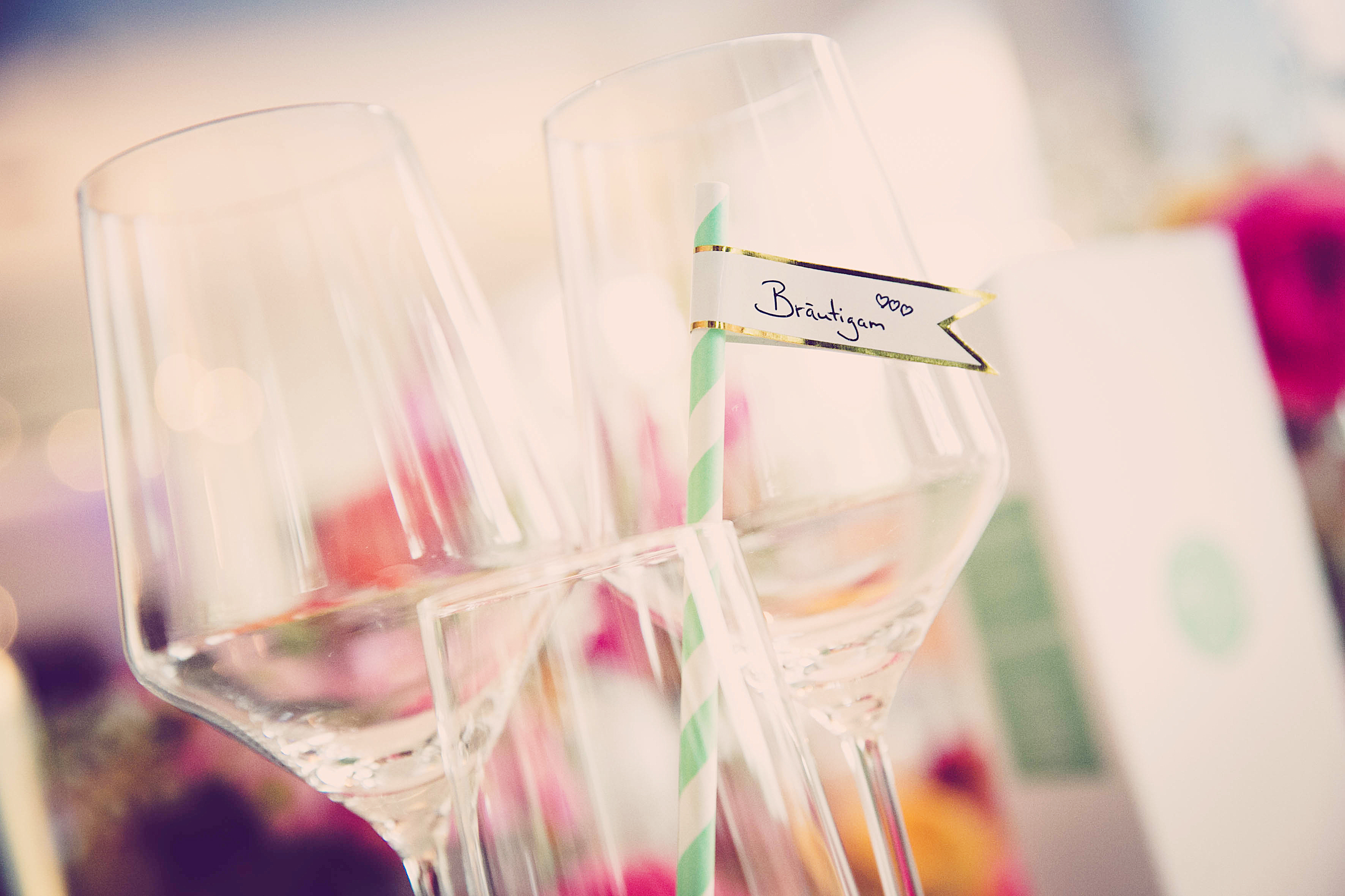 Platzkarten dürfen auf keiner Hochzeit fehlen! Wer möchte schon, dass sich die Exfrau vom Schwiegerpapa plötzlich am gleichen Tisch mit ihrer Nachfolgerin findet? Aber auch bei weniger explosiven Mischungen machen Platzkarten auf jeder guten Hochzeit einen Sinn. Ob man nur die Tische zuweist oder jeden einzelnen Platz, ob man Freundeskreise trennt oder zusammen platziert, das kann jedes Brautpaar selber entscheiden. Aber der Style sollte zur Hochzeit passen. Das Tolle: gerade bei den Platzkarten lässt sich etwas vom Hochzeitsbudget einsparen, da man sie auch wunderbar selber gestalten kann. In unserem Fall hatten wir uns für gestreifte Vintage-Strohhalme in mint entschieden. (Mintfarben war unsere gesamte Hochzeitspapeterie, wie Ihr seht – von den Einladungen bis zu den Menükarten.) Die Strohhalme habe ich mit passenden weißen und mintfarbenen Fähnchen beklebt und mit Namen beschriftet. Die Fähnchen waren selbstklebend und fertig gekauft, aber natürlich lassen die sich auch selber basteln. Ich habe den ganzen Abend mein Wasser (im Wechsel mit Sekt natürlich ;)) durch den Strohhalm gesüppelt und mich wie Bolle gefreut. Auch den Gästen hat die Idee gefallen. Farben gibts wie Sand am Meer, diese Platzkarten passen sich wunderbar jedem Hochzeitsthema an. Remember – it’s all those little things…